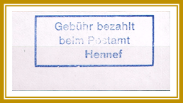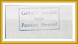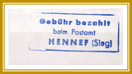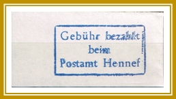 Type 1.2: Dreizeilig, Masse H=1,9 cm, B = 4,4 cm, „Gebühr bezahlt beim Postamt Hennef“ Farbe: Dunkelblau |