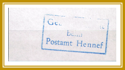 Type 1.3: Dreizeilig, Masse H=1,9 cm, B = 3,5 cm, „Gebühr bezahlt beim Postamt Hennef“ Farbe: Dunkelblau |