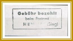 Type 1.4: Dreizeilig, Masse H=1,9 cm, B = 4,6 cm „Gebühr bezahlt beim Postamt Hennef (Sieg)“, Farbe: Grau |