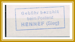 Type 1.4: Dreizeilig, Masse H=1,9 cm, B = 4,6 cm „Gebühr bezahlt beim Postamt Hennef (Sieg)“, Farbe: Violettblau |