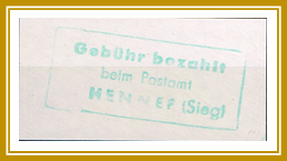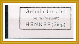 Type 1.4: Dreizeilig, Masse H=1,9 cm, B = 4,6 cm „Gebühr bezahlt beim Postamt Hennef (Sieg)“, Farbe: Schwarz |