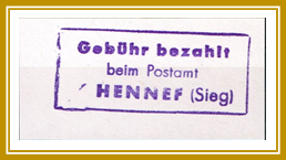 Type 1.4: Dreizeilig, Masse H=1,9 cm, B = 4,6 cm „Gebühr bezahlt beim Postamt Hennef (Sieg)“, Farbe: Violett |