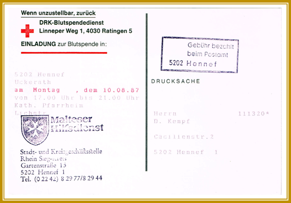 1987, 10. August: Massendrucksache des Malteser Hilfsdienst mit Stempel Type 2.1: „Gebühr bezahlt beim Postamt 5202 Hennef“, Postleitzahl links eingerückt.