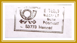 Type 5.6 Dreizeilig, Masse H=2,25 cm, B = 4,4 cm „Deutsche Post AG Entgelt bezahlt 53773 Hennef“, Farbe: Schwarz, zus. großes Logo rechts |