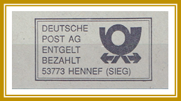 Type 5.7 Dreizeilig, Masse H=2,25 cm, B = 4,4 cm „DEUTSCHE POST AG ENTGELT BEZAHLT 53773 HENNEF (SIEG)“, Farbe: Schwarz, zus. großes Logo rechts |