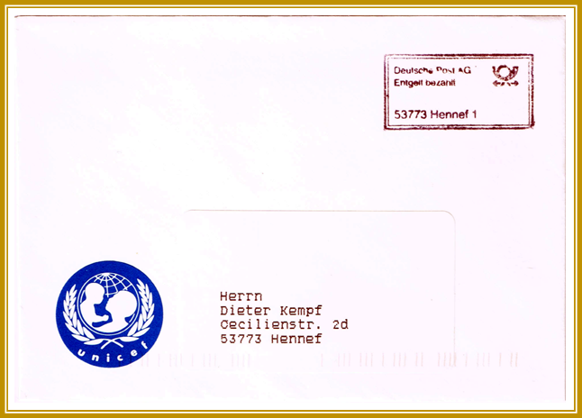 Infopost gelaufen von Hennef 1 nach Hennef mit Stempel Type 5.5: „Deutsche Post AG Entgelt bezahlt 53773 Hennef 1“