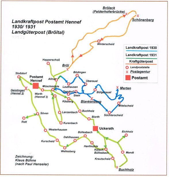 1931 unterstanden dem Postamt Hennef: 1 Postamt (Uckerath) 7 Postagenturen, 32 Landpoststellerı