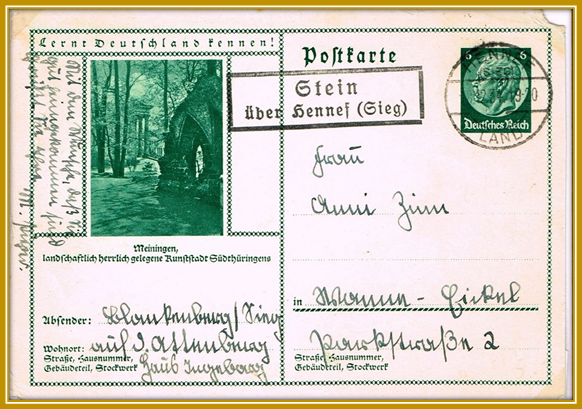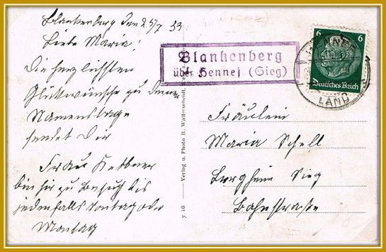 1933: 25. Juli, Postkarte von Blankenberg nach Bergheim (Sieg), portogerecht 6 Rpfg. grün, Blankenberg scheint 1933 keine Postagentur mehr gewesen zu sein.