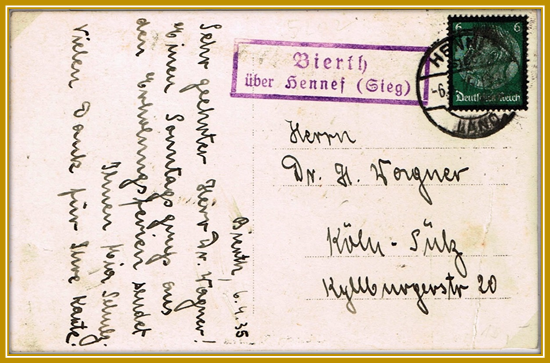 1935: 6. April, Postkarte von Bierth nach Köln-Sülz, portogerecht 6 Rpfg. grün
