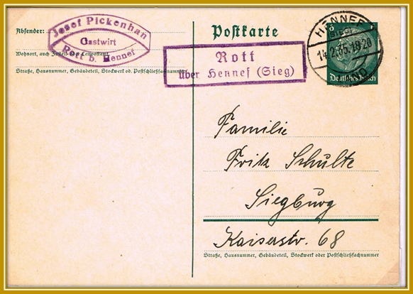 1935: 14. Februar, Postkarte mit Wertstempel 6 Rpfg, grün von Rott nach Siegburg portogerecht