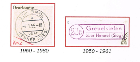 Um 1950 kamen Rundstempel und Rahmen-Gummistempel mit der alten Postleitzahl “22c” zur Verwendung. Der Stempeleinsatz war jedoch fließend. Vielfach blieben auch die alten Stempel im Betrieb.