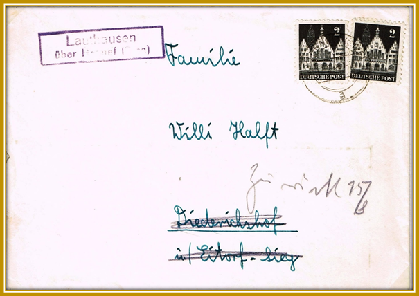 1949: 14. März, Drucksache von Lauthausen nach Dietrichshof/ Eitorf portogerecht 4 Dpfg. neuer Gummistempel: “Lauthausen über Hennef (Sieg)” Normalschrift (geschlossen: 1977)