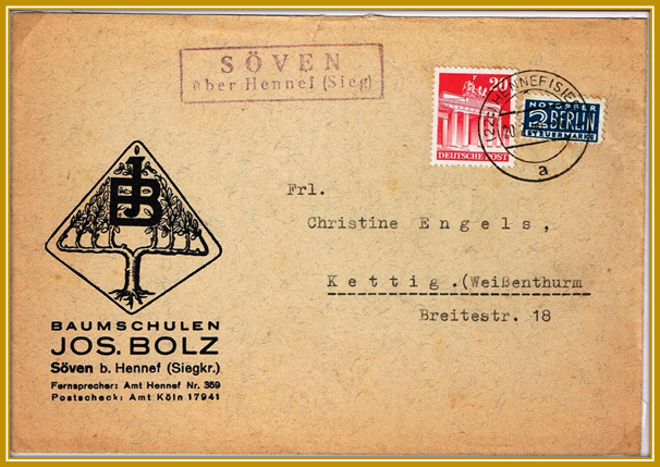 1950: 20. Februar, Brief von Söven nach Kettwig, portogerecht 20 Dpfg. + Notopfer Berlin Gummistempel: “SÖVEN über Hennef (Sieg)” Normalschrift, geschlossen: 1993