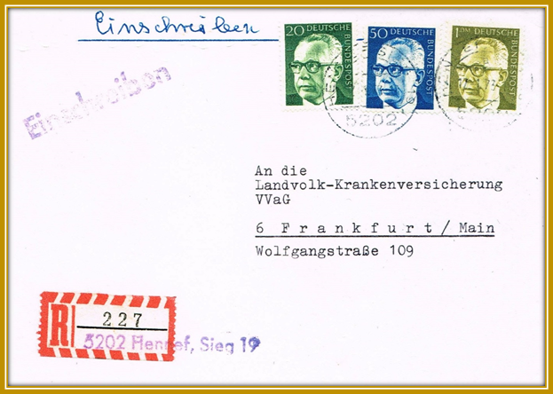 1973: 18. Januar, Einschreiben-Brief von Stossdorf nach Frankfurt, portogerecht 1,70 DM, Kreistempel “5202 HENNEF 19” (Lauthausen), Einschreiben-Etikett mit Handstempel: “5202 Hennef, 19",