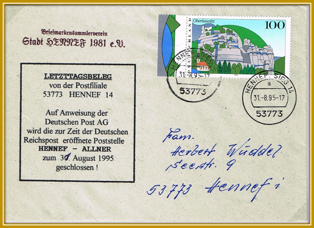 oben: 31. August 1995 Poststelle 14 (Hennef Allner) |