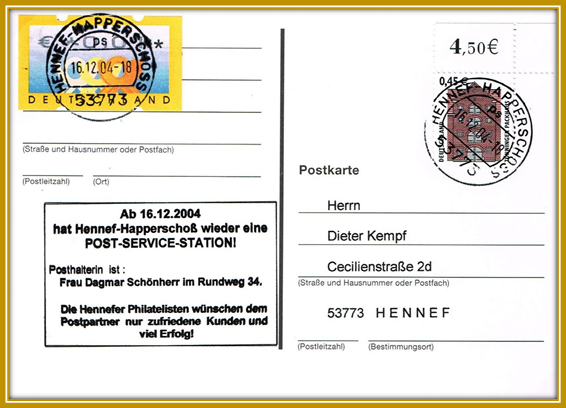 oben: 2002: 26, Oktober, Schließung der Postniederlassung Happerschoß , rechts: Letzttagsstempel (verkleinert)
