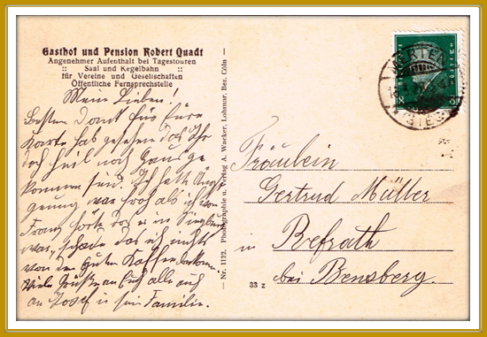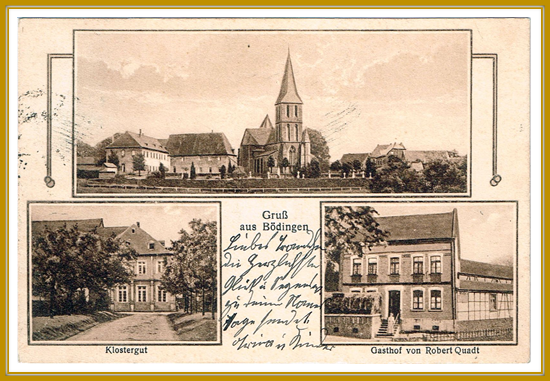 Oben: 1929: 18. März, Postkarte des Gasthofs Quadt in Bödingen, portogerecht 8 Rpfg. von Merten nach Refrath bei Bensberg. Unten: „Gruß aus Bödingen“ mit Bildern der Kirche, des Klostergutes und des Gasthofs von Robert Quadt. |