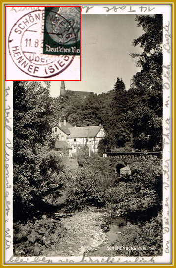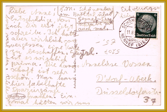 Oben: 1930, 11. August. Postkarte frankiert mit 6 Pf (Hindenburg), gelaufen von Schönenberg über Hennef nach Düsseldorf – Oberkassel.