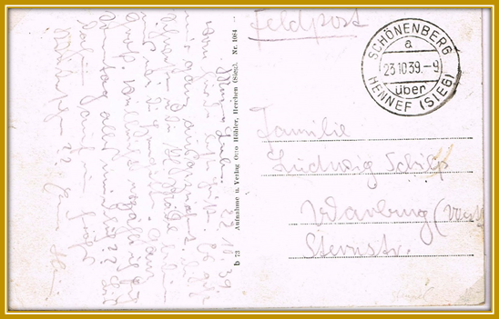 1939: 23. Oktober Feldpostkarte von Schönenberg nach Warburg
