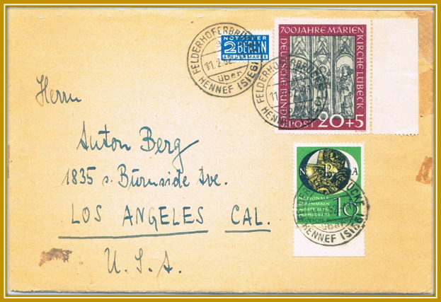 1952: 1 1. Februar, Überseebrief von Felderhoferbrücke nach Los Angeles/ USA portogerechte 30 Dpfg. (für Auslandsbriefe war die Notopfermarke Berlin nicht erforderlich)