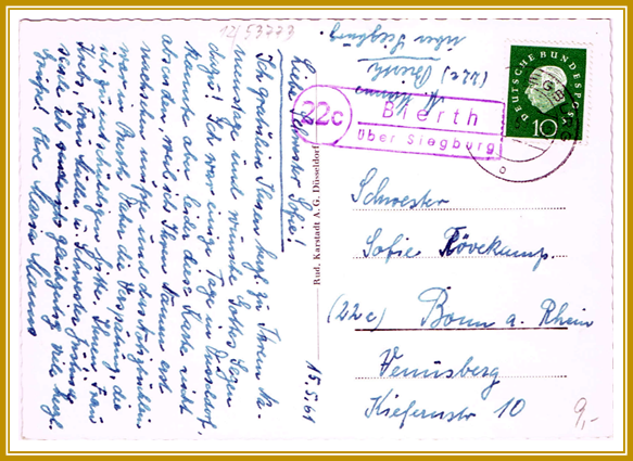1961, 15. Mai. Spät verwendeter Rahmenstempel „Bierth über Siegburg“. Normalerweise liefen die Rahmenstempel mit PLZ 22c bereits früher aus.