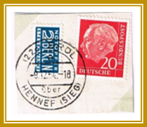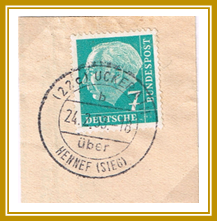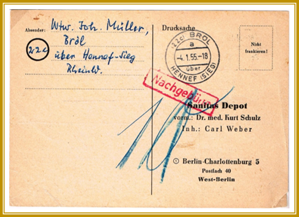 1955: 4. Januar, unfrankierte Drucksache, 10 Dpfg. Nachgebühr, von Bröl nach Berlin, Rundstempel „22c BRÖL a -4.1.55 18 über HENNEF (SIEG)”