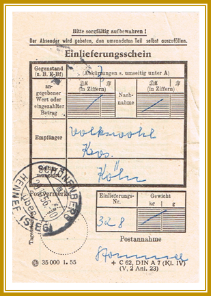 1956, 20. Oktober. Einlieferungsschein mit Stempel „Schöneberg über Hennef (Sieg) |
