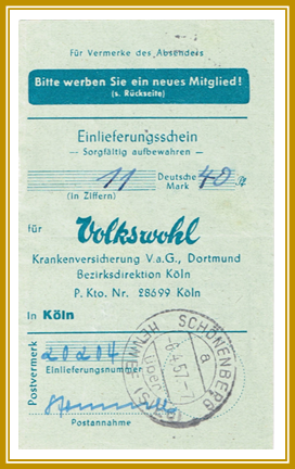 1957, 6. April. Einlieferungsschein der Volkswohl Krankenversicherung mit Stempel „Schöneberg über Hennef (Sieg) |
