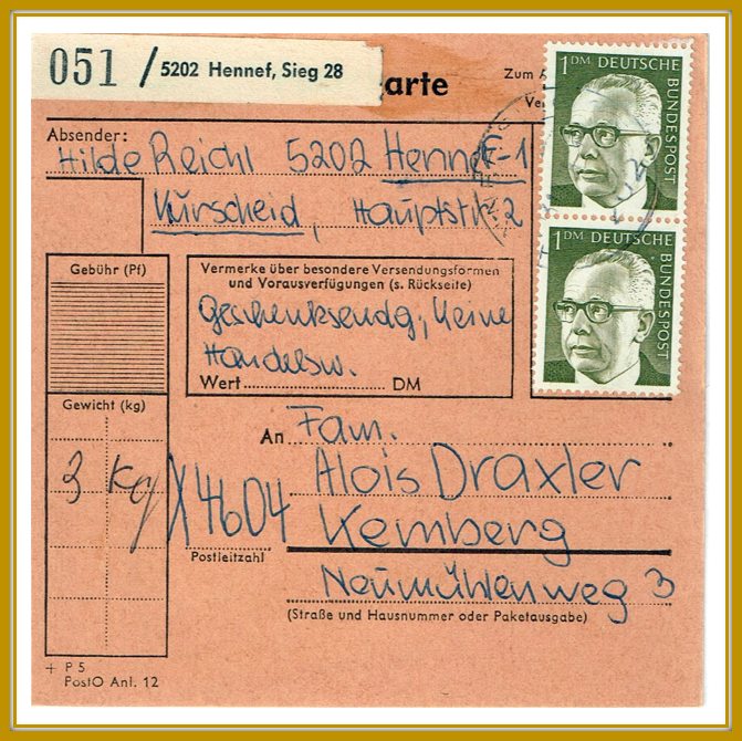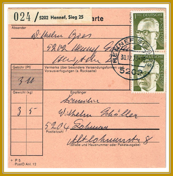 1975, 3. Dezember Paketkarte Hennef (Sieg) 28 (Kurscheid) nach Kemberg. Gebühr: 3,50 DM für ein Paket von 3 kg Gewicht. Frankiert mit 2 x 1,- DM (Mi. Nr. 644) auf der Vorderseite, 1 x 1,- DM (Mi. Nr. 644) und 1 x 50 Pf (Mi. Nr. 844) auf der Rückseite. |