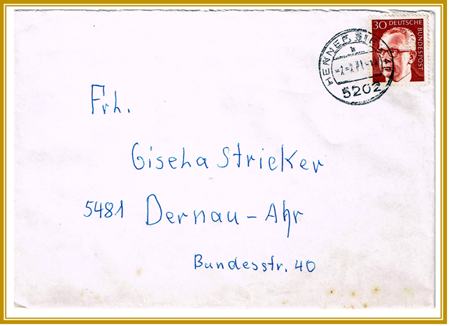 Unten: 1971, 7. Juli. Brief frankiert mit 30 Pf gelaufen von 5202 Hennef, Sieg 41 (Uckerath) nach Dernau |