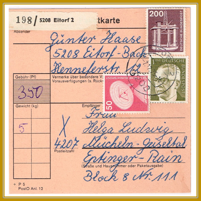 1975,2. Dezember: Paketkarte Eitorf 2 (Bach) nach Mücheln - Geiseltal in Sachsen Anhalt. Gebühr: 3,50 DM für 5 kg Gewicht. Frankiert mit 1 x 1,- DM (Mi. Nr. 644) und 1 x 2,- DM (Mi. Nr. 858) und 1 x 50 Pf (Mi. Nr. 851)auf der Vorderseite. Das Postamt Bach kam bis 1962 zu Eitorf und wurde vorher durch die Hennefer Post bedient.