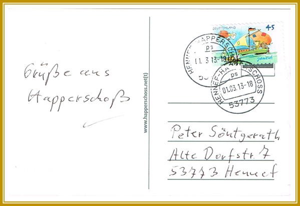 2013, 1. März. Postkarte mit dem Stempel Hennef – Happerschoß und 5-stelliger Postleitzahl nach Hennef - Lauthausen. Seltener Stempel der Postfiliale Happerschoß, die nur 1 Stunde am Tag geöffnet ist.