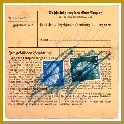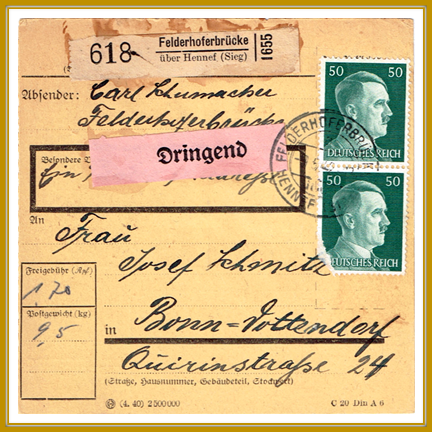 1942, 9. Mai. Paketpostkarte gelaufen von der Postagentur Felderhofer Brücke (Heute Bröleck und zu Ruppichteroth gehörig) nach Bonn - Dottendorf mit rosa Aufkleber „Dringend“.
