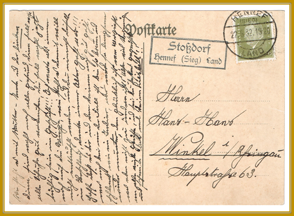 1932, 22. Juni. Postkarte gelaufen von Hennef – Stoßdorf nach Winkel im Rheingau frankiert mit 6 Pfennig (Michel Nummer 465, gelboliv, Reichspräsident Friederich Ebert). Stempel: Kreisstegstempel „HENNEF (SIEG) – LAND“ und seltenem Gummi – Rechteckstempel „Stoßdorf – Hennef (Sieg) Land“.