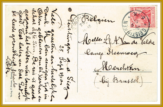 1910, 25. September. Postkarte gelaufen von GEISTINGEN (Stempel K1) nach MERCHTEM in Belgien. Merchtem ist eine belgische Gemeinde in der Region Flandern. Sie liegt in der Provinz Flämisch-Brabant und gehört zum Arrondissement Halle-Vilvoorde. Die Gemeinde besteht aus den Ortsteilen Brussegem, Hamme und Merchtem.