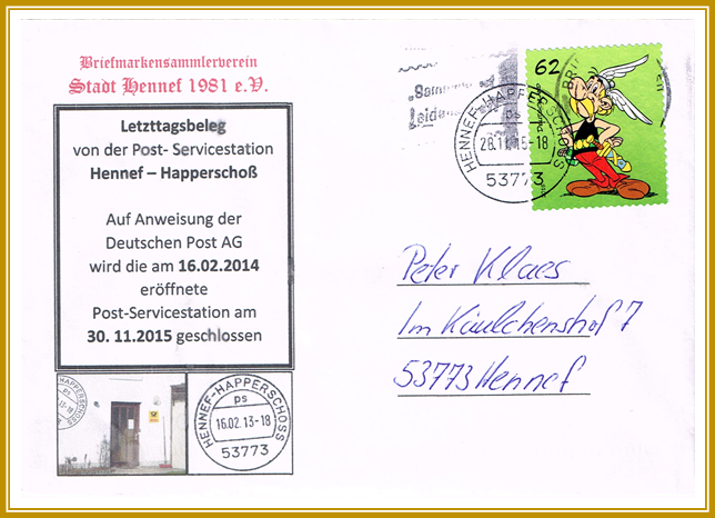 2015. 28. November. Brief portogerecht frankiert mit 62 Cent gelaufen von Hennef – Happerschoss nach Hennef – Lauthausen. Letzttagsbeleg der Post-Service Station. Diese Poststelle war die einzige Poststelle in Hennef, die noch den Ortsnamen neben dem Stadtnamen im Stempel tragen durfte.