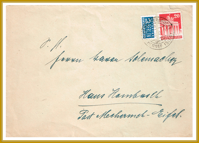 1950: 12. Februar. Briefhülle von Felderhoferbrücke (Bröleck) nach Haus Hombusch bei Mechernich in er Eifel, portogerecht frankiert mit 20 Pf + 2 Dpfg. Notopfer-Spendenmarke Berlin. 2-Ring-Rundstempel: „Felderhoferbrücke / 12.2.1950 / über Hennef (Sieg)“.