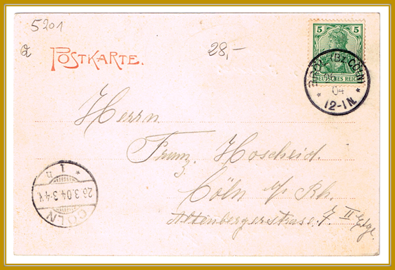 1906, 26. März. Postkarte gelaufen von Bröl (Nzk Cöln) nach Cöln portogerecht frankiert mit 5 Pf (Michel Nr. 70, Germania in grün). Die Karte ist gestempelt mit Kreisstempel von BRÖL (Bz. CÖLN) und Ankunftsstempel CÖLN