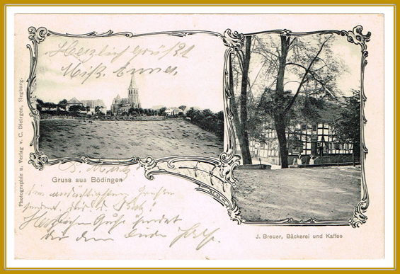 Motiv: Blick auf Bödingen mit der Kirche und Ansicht auf die Bäckerei und das Cafe Breuer
