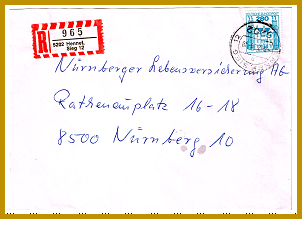1985, 7. Februar: Einschreiben von Hennef 12 (Geistingen) nach Nürnberg, portogerecht mit 280 Pfg frankiert und Einschreibezetteln mit der Nummer 965 und Aufdruck „5202 Hennef / SIEG 12“, Kreisstempel: “5202 HENNEF (SIEG) 12” (Geistingen)