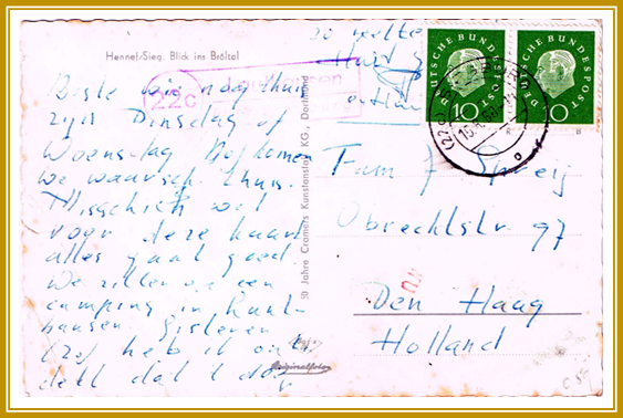 1960, 15. August. Postkarte gelaufen von Hennef – Lauthausen nach Den Haag in Holland portogerecht frankiert mit 2 x 10 Pf (Michel Nr. 303, Prof. Dr. Theodor Heuss in grün). Gestempelt mit Zweikreis-Stegstempel „(22c) SIEGBURG / 15.8.60 – 10“ und violettem Rahmenstempel „22c Lauthausen / über Siegburg“.