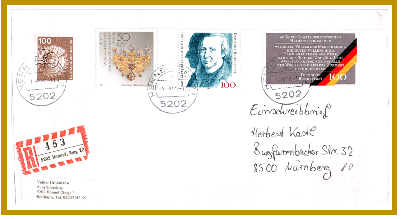 1990, 1. September: Einschreiben von Hennef (Sieg) 22 (Bödingen) nach Nürnberg 80 portogerecht frankiert mit 3,50 DM (+ 25 Pf) (1 x Mi. Nr. 854 Braunkohlenförderbagger, 1 x Berlin Mi. Nr. 818 Brustschmuck um 1700, 1 x Mi. Nr. 1473 Matthias Claudius, 1 x Mi. Nr. 1470 Charta der Heimatvertriebenen). Zusätzlich Einschreibezettel mit der laufender Nummer 453 von 5202 Hennef, Sieg 22. Man beachte, dass dieser Brief mit Marken der BRD und von West-Berlin frankiert wurde.