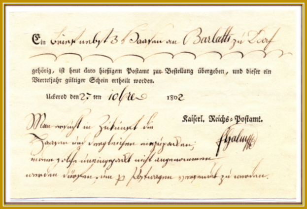 Neujahrsbraten aus eigener Jagt zukommen lassen. Postschein (Einlieferungsquittung) über “Ein Brief und 3 Hasen”. Im Auftrag des Grafen von Nesselrode (bester Postkunde in Uckerath) wurden diese in der Posthalterei zur Weiterbeförderung nach Düsseldorf aufgegeben. Der Graf wollte wohl einem Freund einen Neujahrsbraten aus eigener Jagd zukommen lassen.