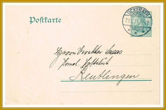 Oben: 1911, 23. Februar. Postkarte (Ganzsache) von Uckerath nach Reutlingen mit Kreisstegstempel.