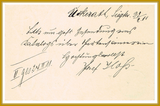 Unten: Rückseite der Postkarte. Aus dem Inhalt geht hervor, dass Herr Josef Hahs einen Katalog zugeschickt bekommen möchte.