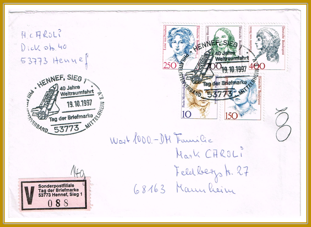 und Sonderstempel „40 Jahre Weltraumfahrt“ gelaufen von Hennef nach Mannheim.