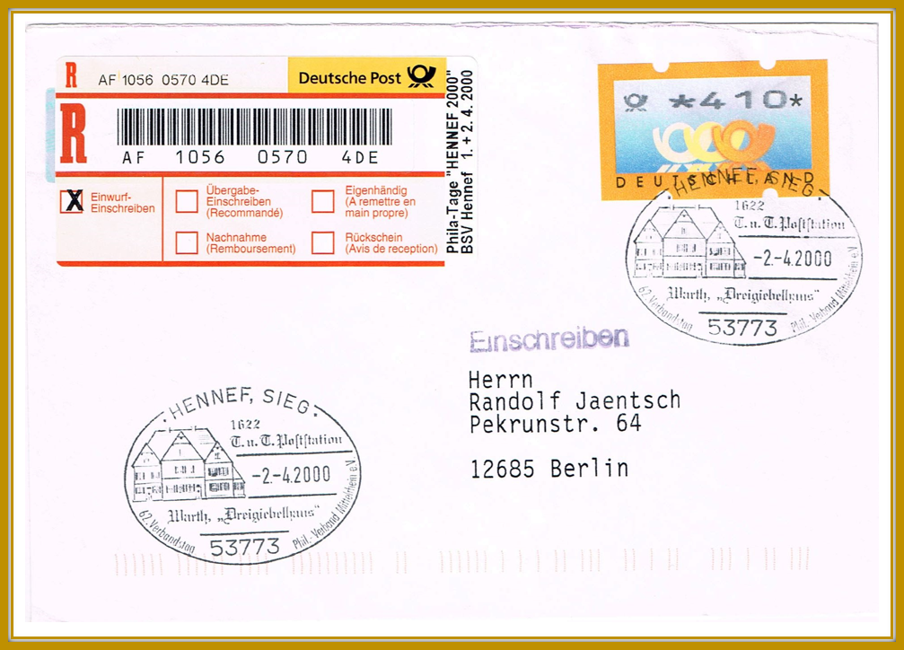 Unten: 2000, 2. April: Einschreiben mit 2 x Sonderstempel