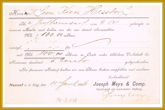 frankiert mit 5 Pf Germania mit Lochung JM (Joseph Meys). Ankunft schon am 12. April 1906.
