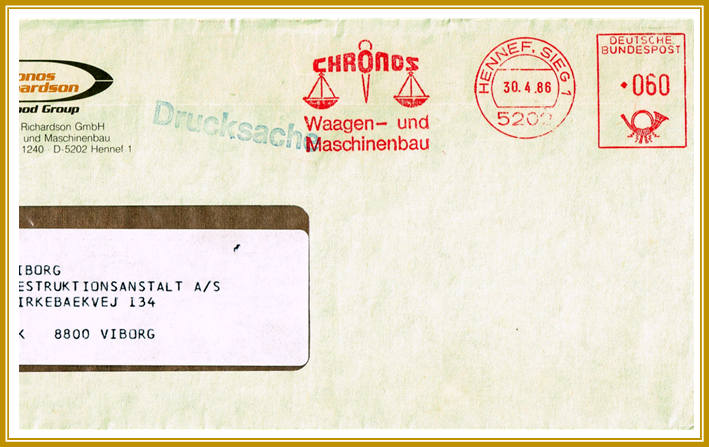 1986, 30. April. Freistempler mit Aufdruck „60 Pf“ der Firma Chronos gelaufen von Hennef nach Viborg, Dänemark.