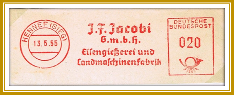 1955, 13. Mai. Briefstück frankiert mit Freistempel der J.F. Jacobi G.m.b.H. Eisengießerei und Landmaschinenfabrik portogerecht entwertet mit 20 Pf. Freistempler vom Type NA 3 mit Posthorn unten produziert mit Francotyp „C“ (Abstand 77 mm). Datum mit Trennpunkten.
